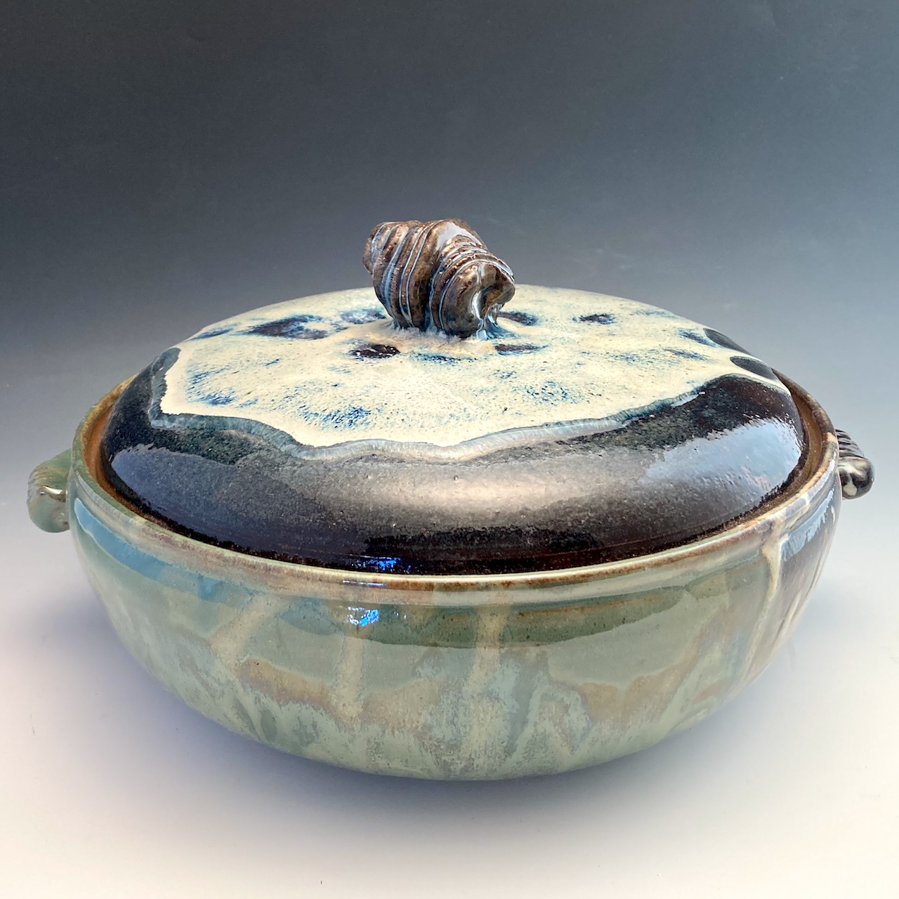 I made Taos 2-Quart Baker on the potter’s wheel with an iron bearing stoneware. First I throw the bowl portion of the baker/casserole and create a galley where the lid will fit. Then I measure the diameter of the bowl with calipers and I throw the lid to fit that diameter.