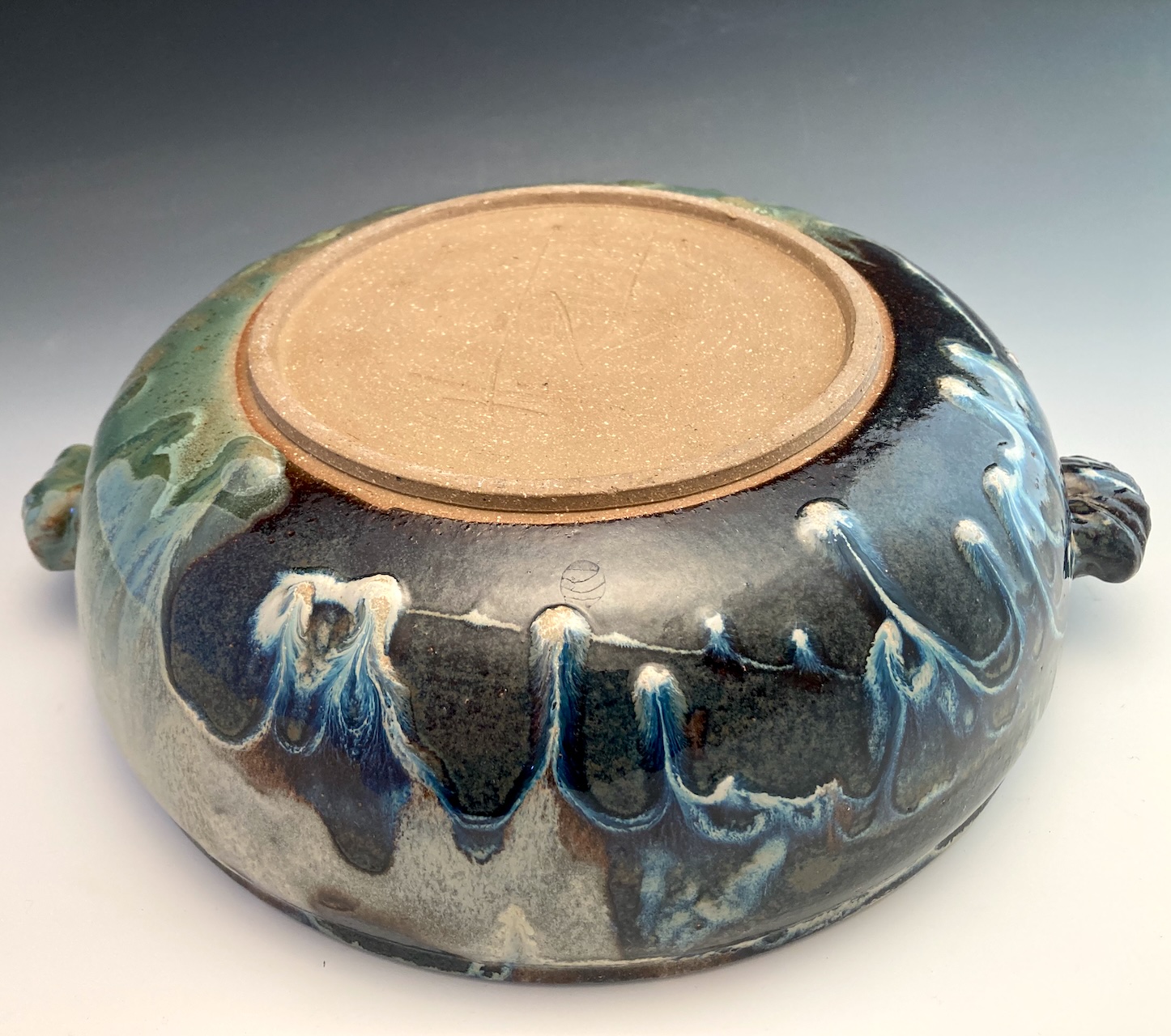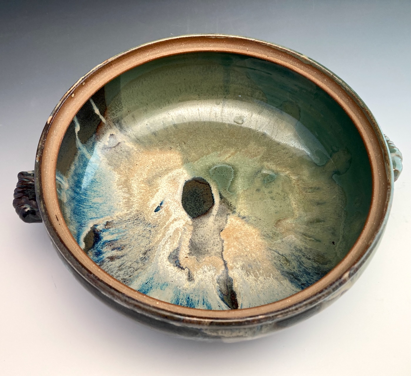 After the baker is bisqued fired and prepped, it’s time to glaze! First, I dip half of the bowl in a floating blue glaze that I make. Next, I dip the opposite half in a copper green glaze that I make. Then, I splash a cream glaze that I make over the “seam” where the two glazes meet. For the final touch, I trail the red gold and daub blooms on the outside of the bowl. And pour the red gold over parts of the inside. For the lid, just the blue with a pond of the red gold floating on top. This is a dynamic combo as it melds together!
