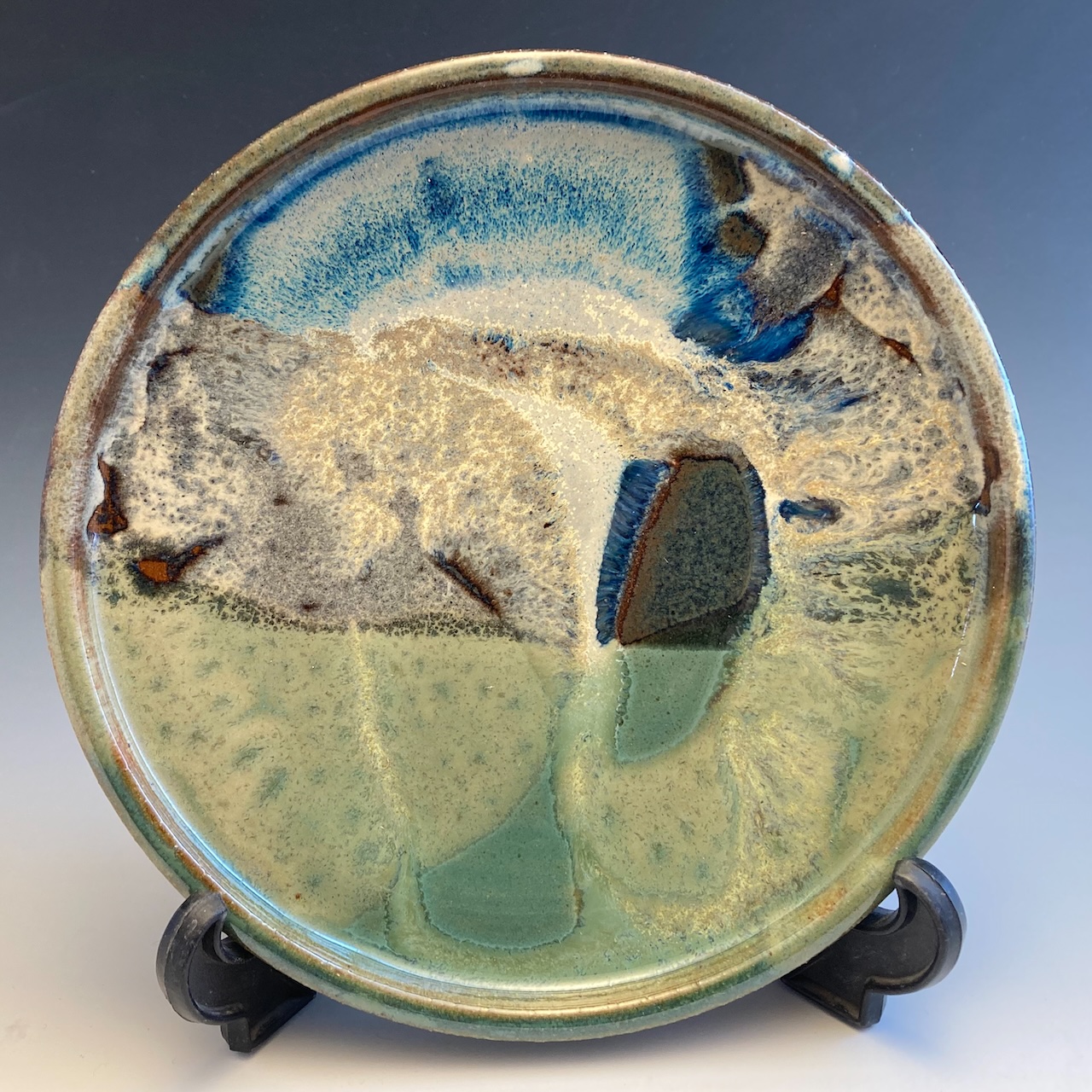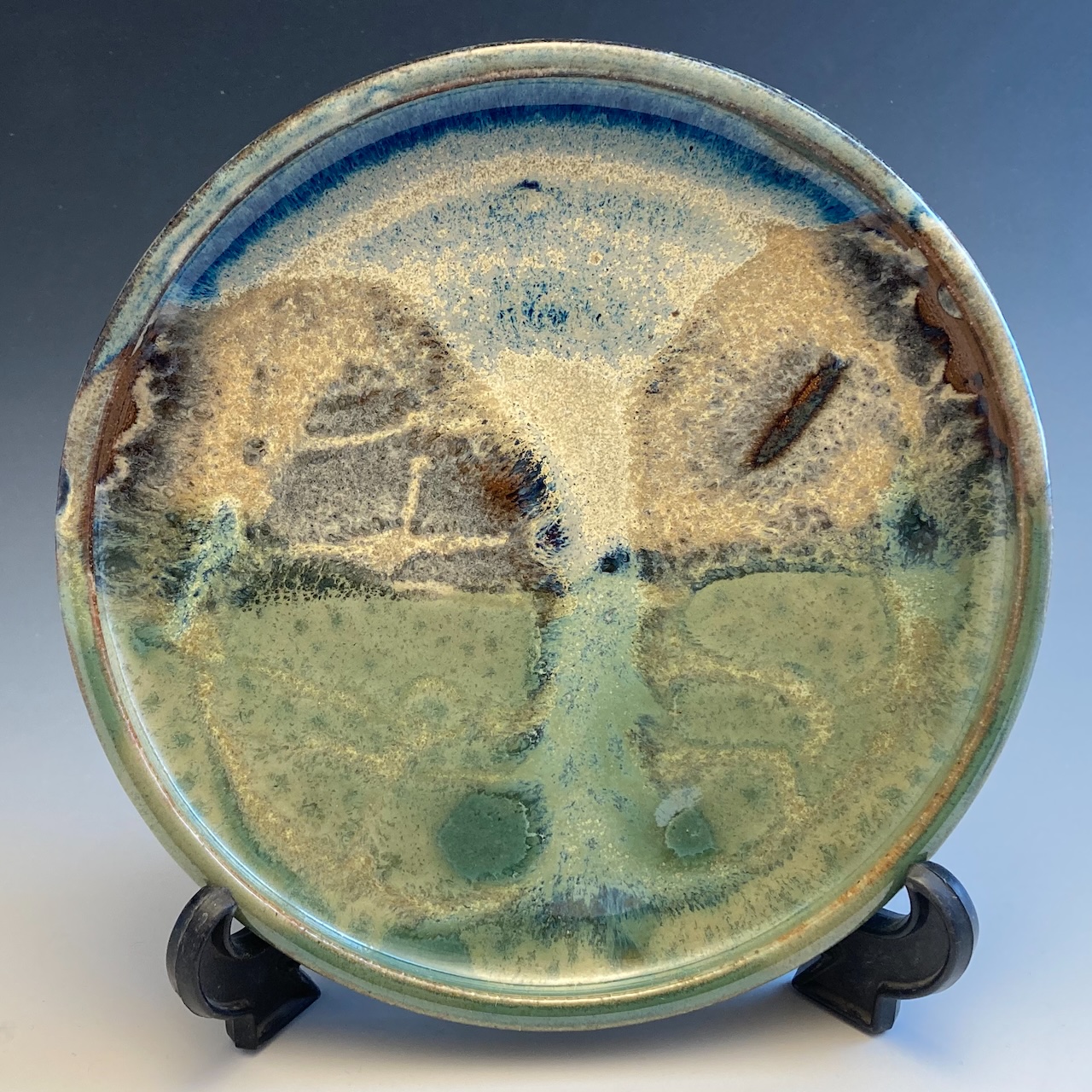 I allow plenty of time for plates to dry because drying slowly helps prevent warping and cracking. First I bisque fire each plate, then I proceed to glazing. The “Taos” glaze consists of 4 overlapping glazes. First I dip about half the plate in a floating blue glaze which I make. Next I dip the remaining portion of the plate in a green glaze which I also make. Then I pour a cream rust glaze over the seam of the first two glazes. I finish off the pattern by pouring red gold glaze over the blue area, allowing it to pool in places. And even though I have developed some skill in applying 4 different glazes to the surface, the melding of these glazes can still be quite amazing and surprising. Sometimes you will see figures. Other times a landscape or seascape. The glaze technique yields consistent yet varied results. This batch was stunning. Only 2 left!