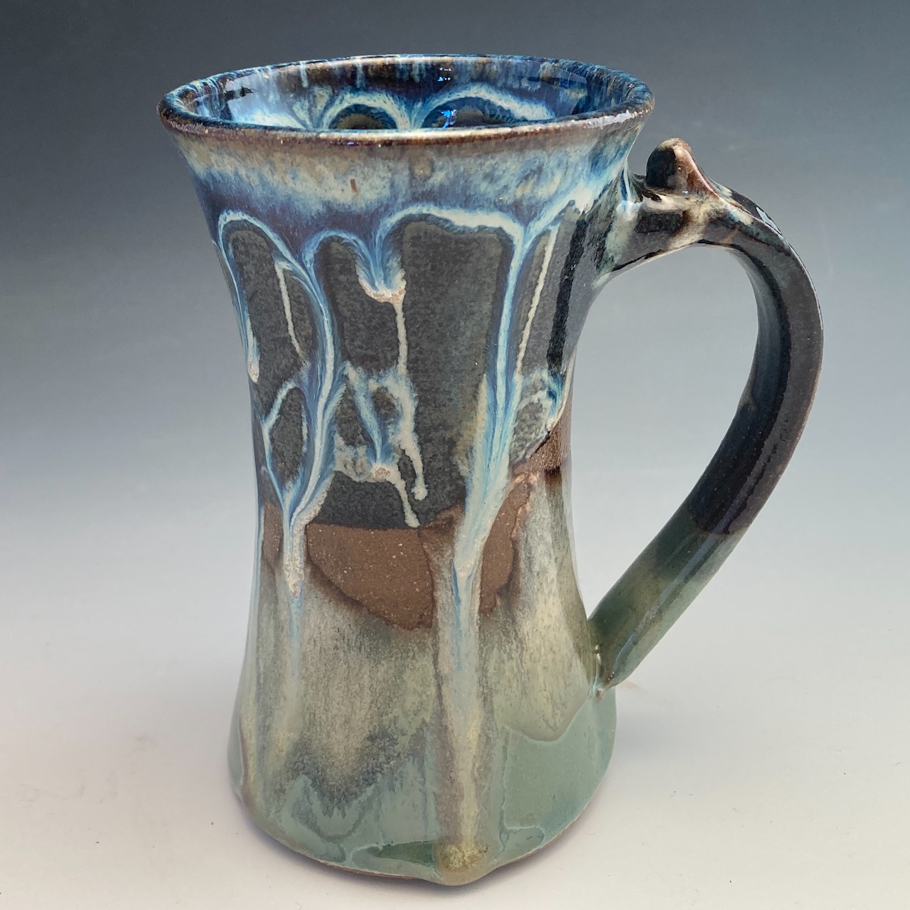 I made Taos Femme Fatale Mug on the potter’s wheel using an iron bearing stoneware clay, which fires out tan. A pulled handle has plenty of room for most hand sizes and added a thumb stop for extra comfort. The bottom is flat.