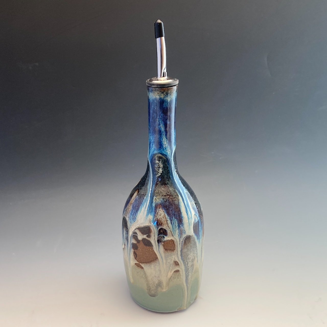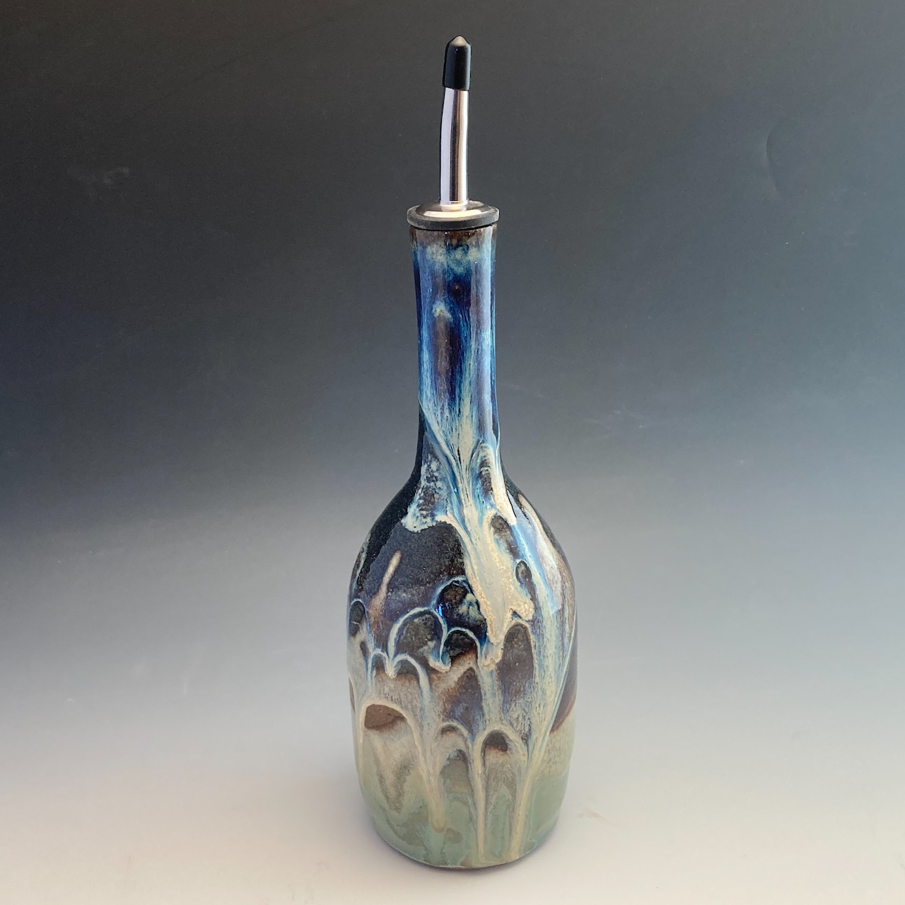 I made Taos Oil Pourer 2 on the potter’s wheel from stoneware clay. It has an elegant bottle shape with a long neck which makes a natural area to grasp. It sits on a flat bottom. A balanced pour. The silicone cork fits snugly in the neck and will not leak.