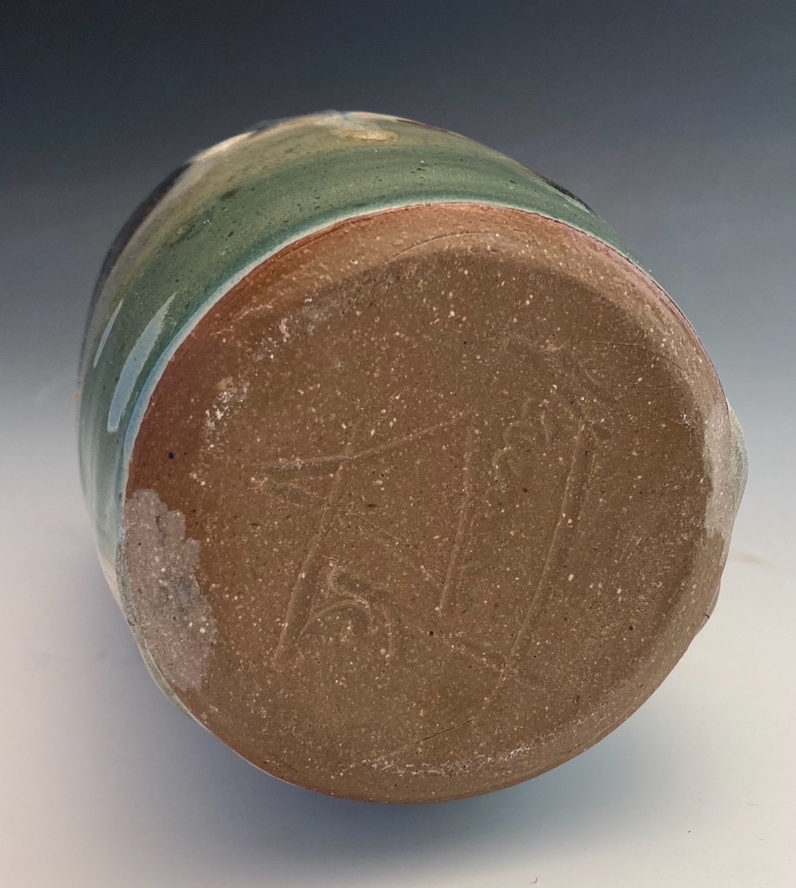 I have developed a technique for combining four different glazes that results in a lovely overlapping of surfaces that often reference the natural landscape of Northern New Mexico – Blue for the NM skies (in this case midnight blue). Green for the pinon and pastures and sage. Cream for the amazing cloud formations. And gold for the brilliant sunshine. I call this combo ‘Taos” and my technique involves dipping, and pouring blue, green, cream, and gold glazes.