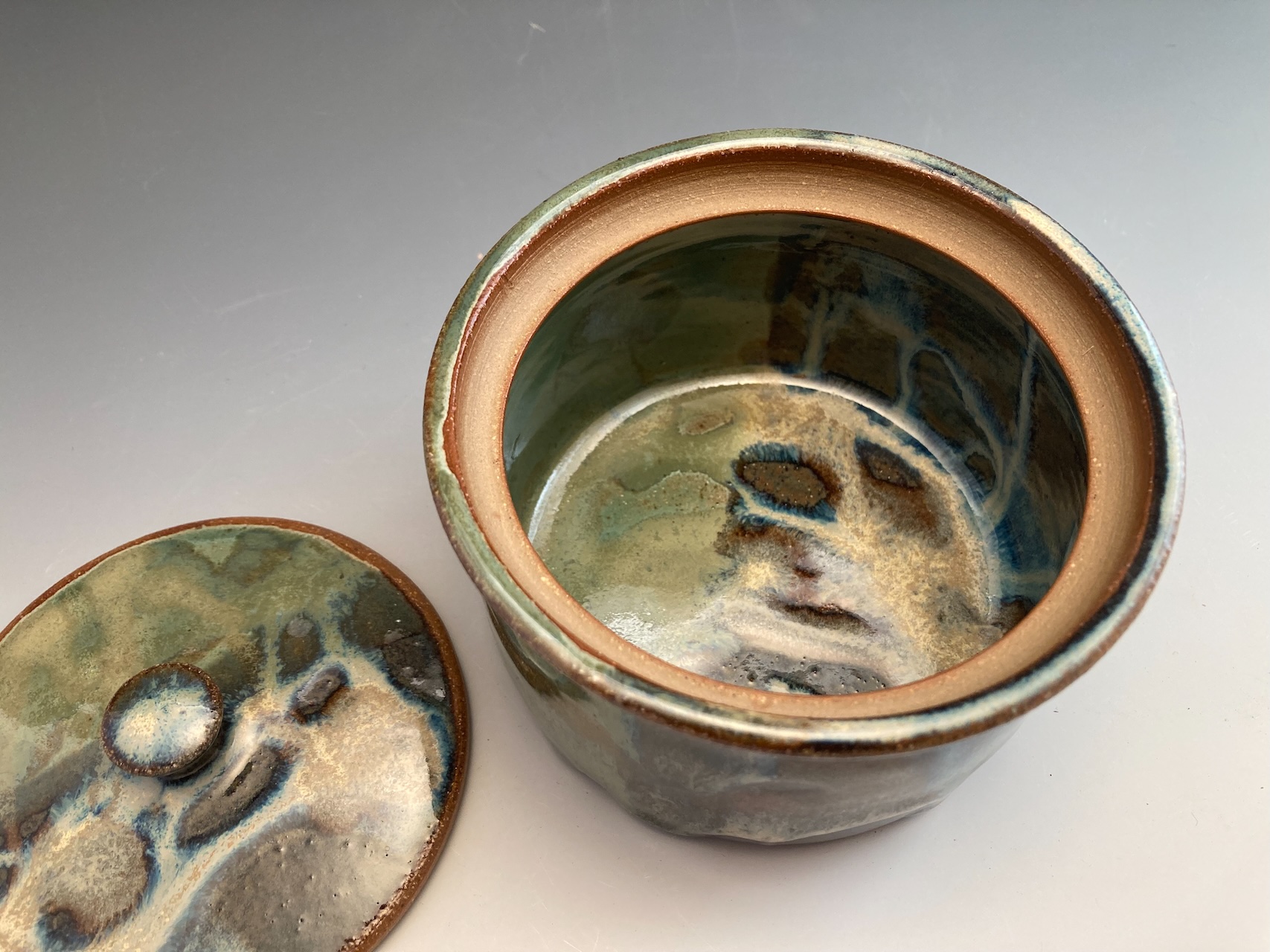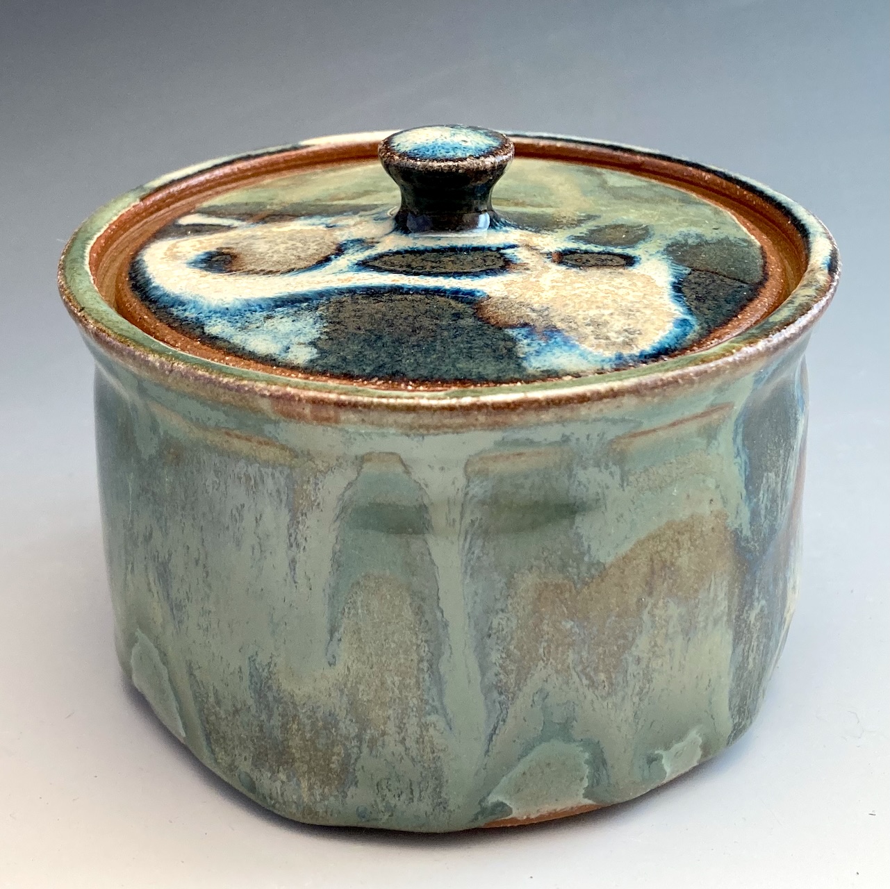 I made Taos Salt Cellar on the potters wheel, with a seated lid and a flat bottom. A low profile jar, wider than it is high. A classic cylindrical shape.