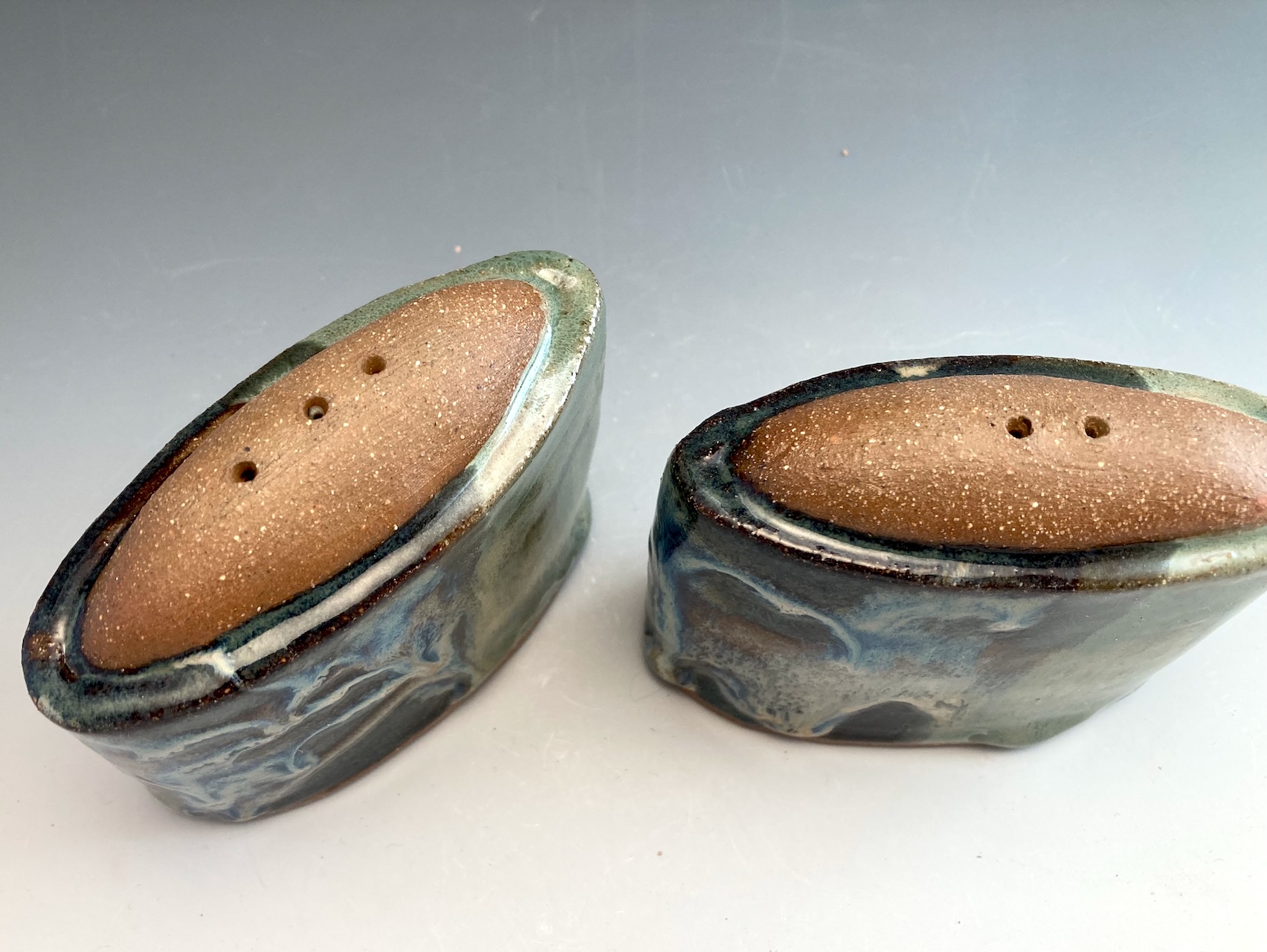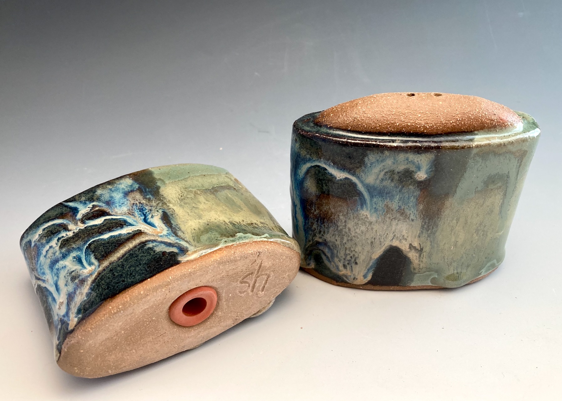 I hand-built Taos Shakers from stoneware clay. First, I designed and cut out a template for my design. I designed these shakers to fit ergonomically in your hand.