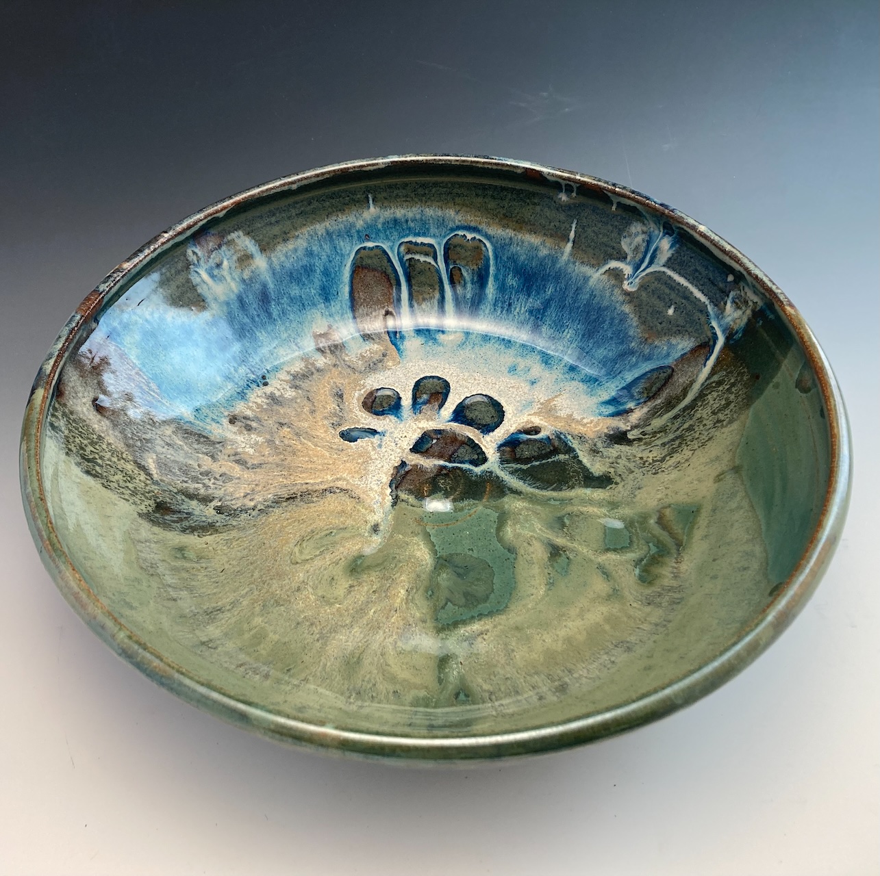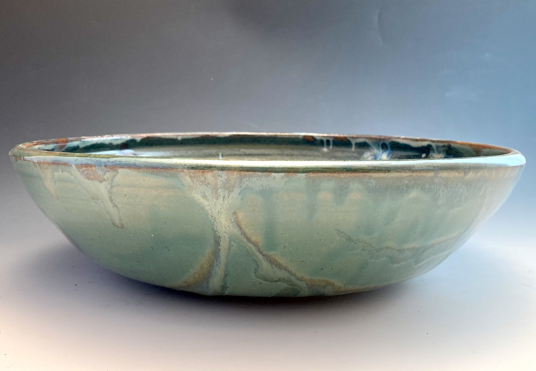 I made Taos Turkey Feathers on the potter’s wheel with stoneware clay with a beaded rim and an ever so slight trimmed foot. A large open bowl form. Stoneware clay is a strong and durable clay body that is ideal for table ware.