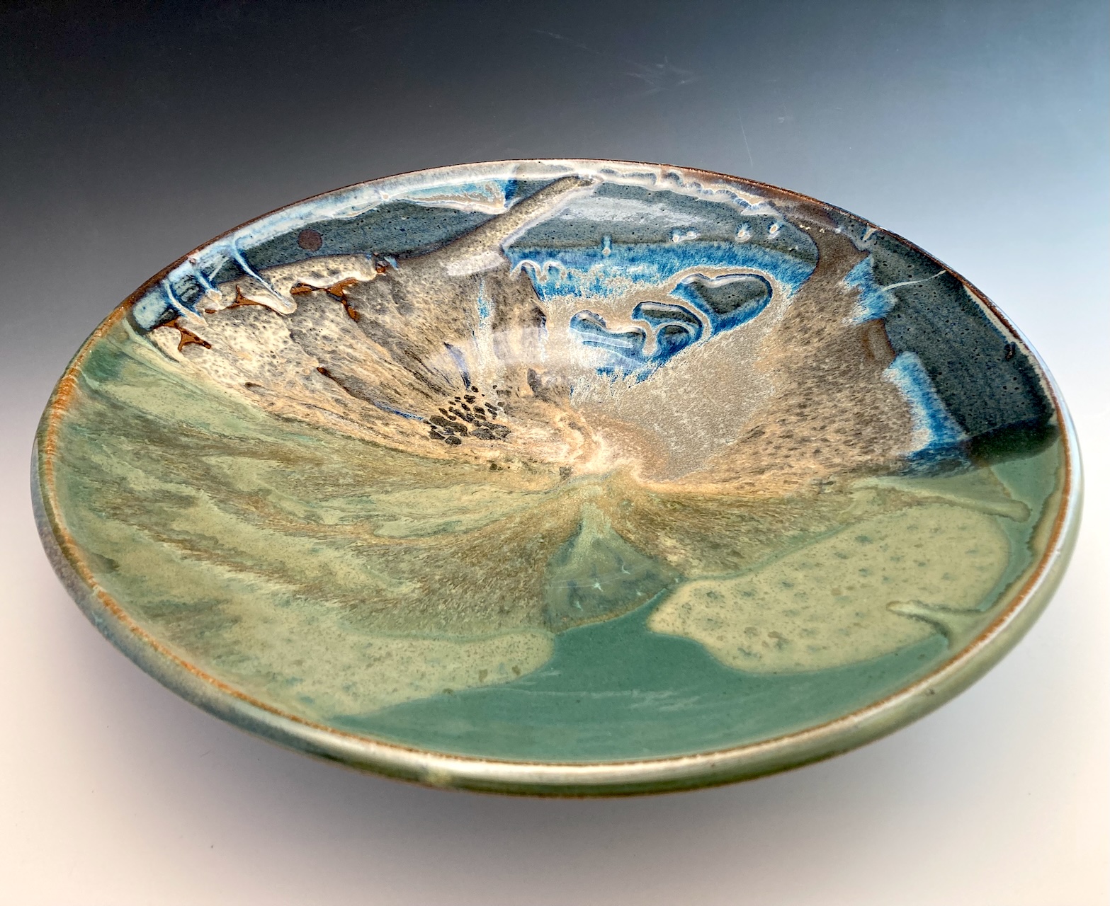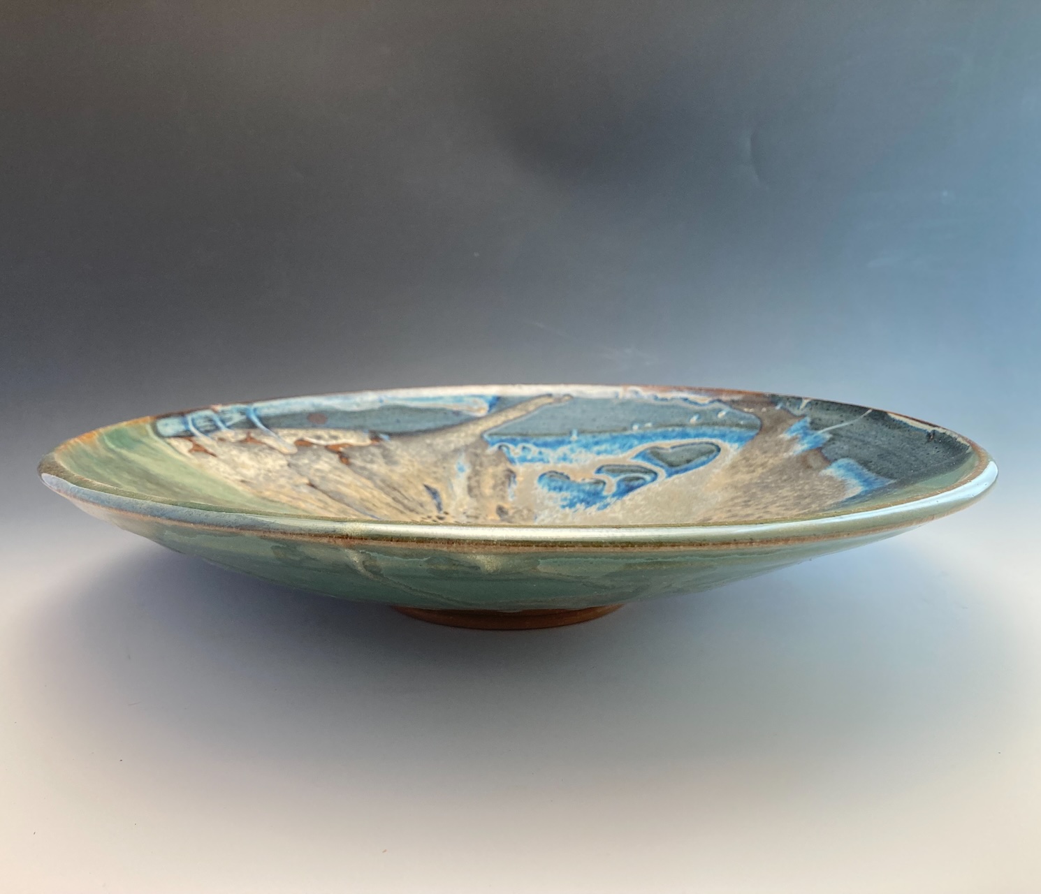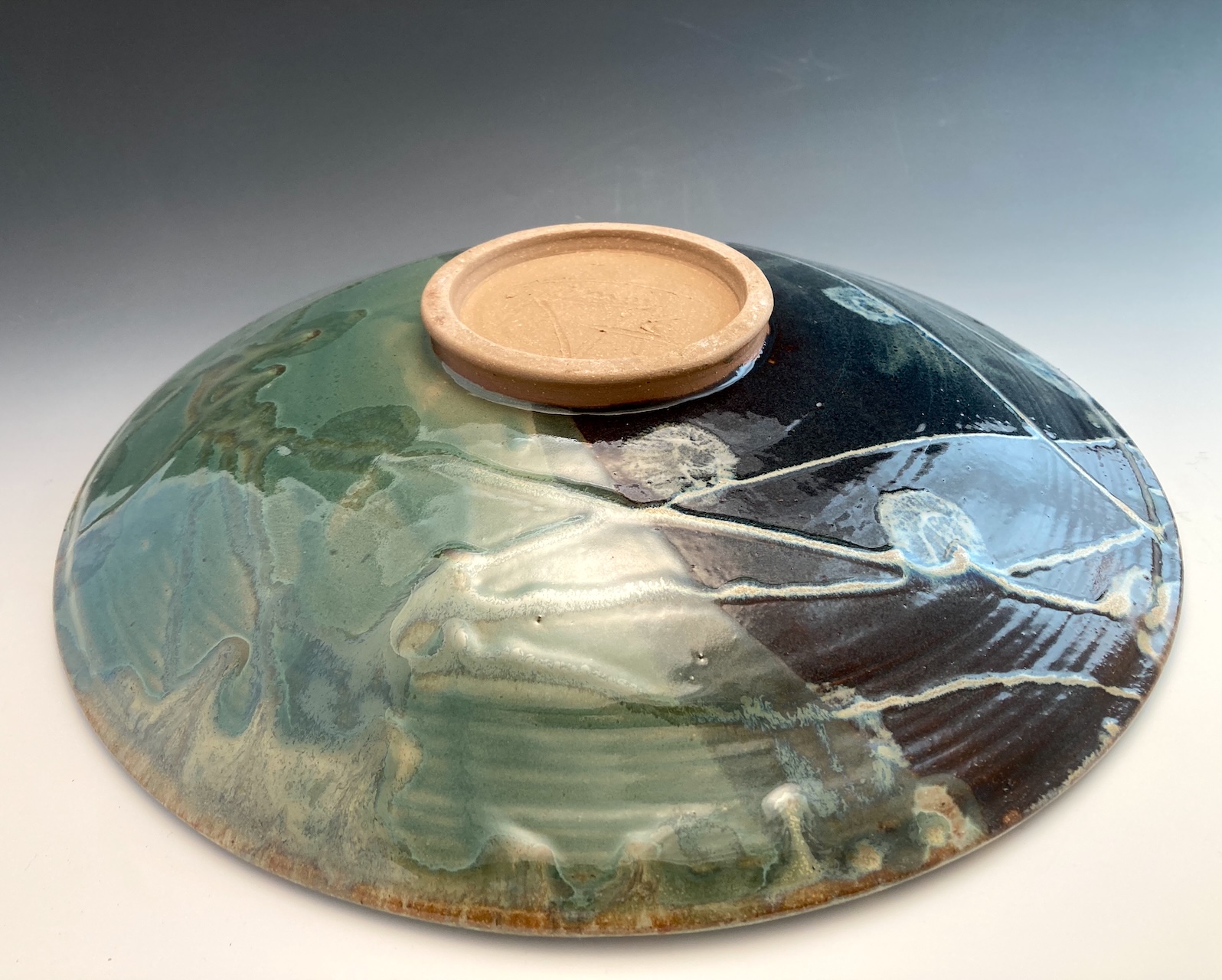 I made Taos Valley on the potter’s wheel with stoneware clay and then trimmed a pedestal foot. A low, open bowl form to the fullest. Stoneware clay is a strong and durable clay body that is ideal for table ware.