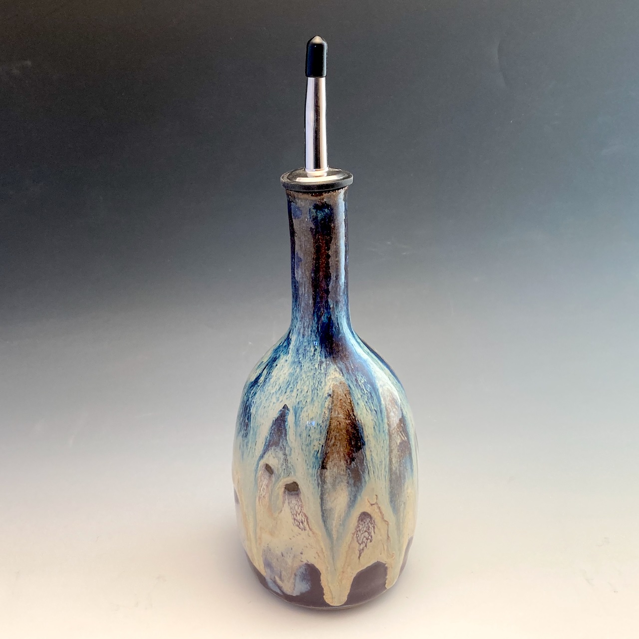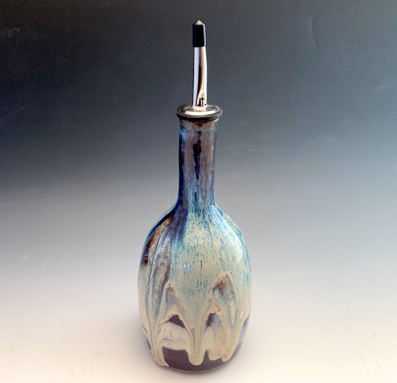 I made Tempest Oil Pourer on the potter’s wheel from stoneware clay. It has an elegant bottle shape with a neck you can grasp easily and pour. It sits on a flat bottom. A balanced pour. The silicone cork fits snugly in the neck and will not leak.