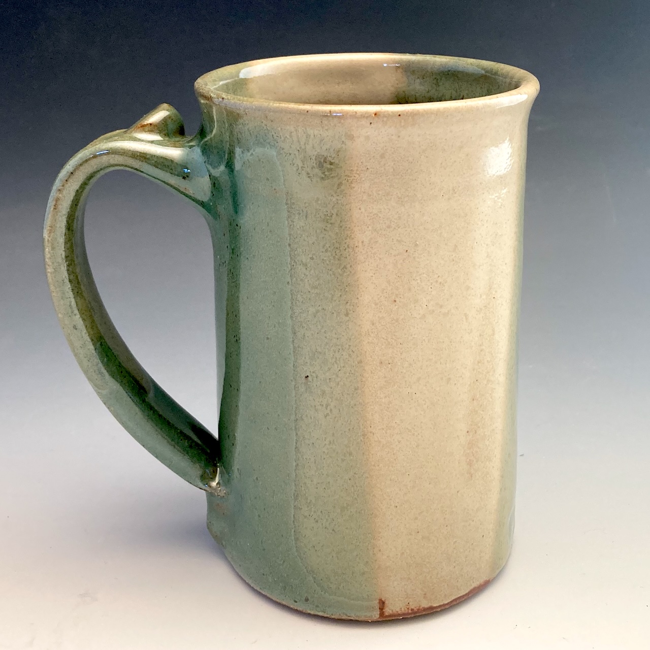 Next, I dip the mug in a cream rust glaze to fill in the gap and overlap the green in places. The overlaps modulates the green which I believe creates an interesting surface. A mostly cream liner. And the result is a clean, tailored look overall.