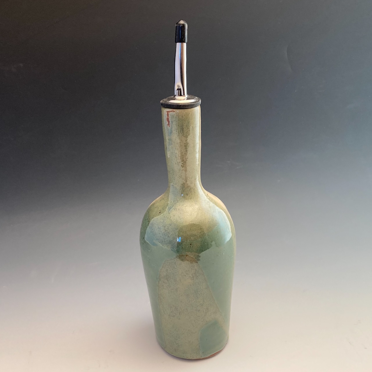 I made Verde Oil Pourer on the potter’s wheel from stoneware clay. It has an elegant bottle shape with a squared shoulder and a long neck which makes a natural area to grasp. It sits on a flat bottom. A balanced pour. The silicone cork fits snugly in the neck and will not leak.